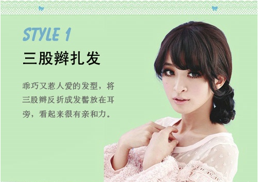 将三股辫发折成优雅的发髻固定在耳旁,看起来整个人亲和力十足,让你走到哪都有好人缘。